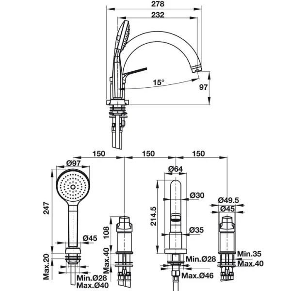 – Bộ trộn bồn tắm 4 lỗ, màu đen mờ