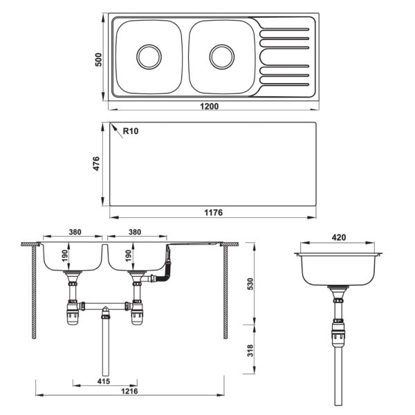 – Chậu rửa 02 hố chậu + 01 bàn chờ ( có thể đảo cánh )