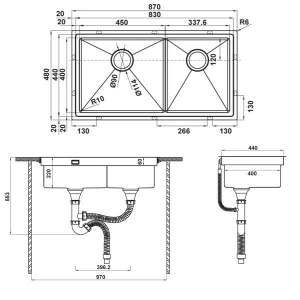 – Chậu rửa chén bát 02 hố chậu bằng nhau