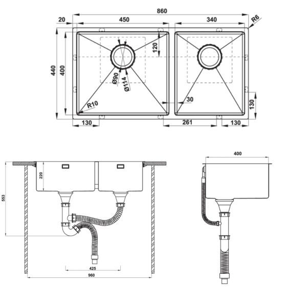 – Kích thước bồn : D450 x R400/ D340 x R400mm
