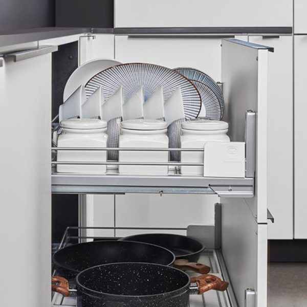 – Thiết kế riêng cho thị trường Châu Á, phụ kiện thích hợp cho lưu trữ các loại chén đĩa thường dùng bởi các gia đình Châu Á. Khay rổ bằng kim loại chắc chắn đảm bảo các dụng cụ bàn ăn luôn an toàn khi đóng và mở hộc tủ